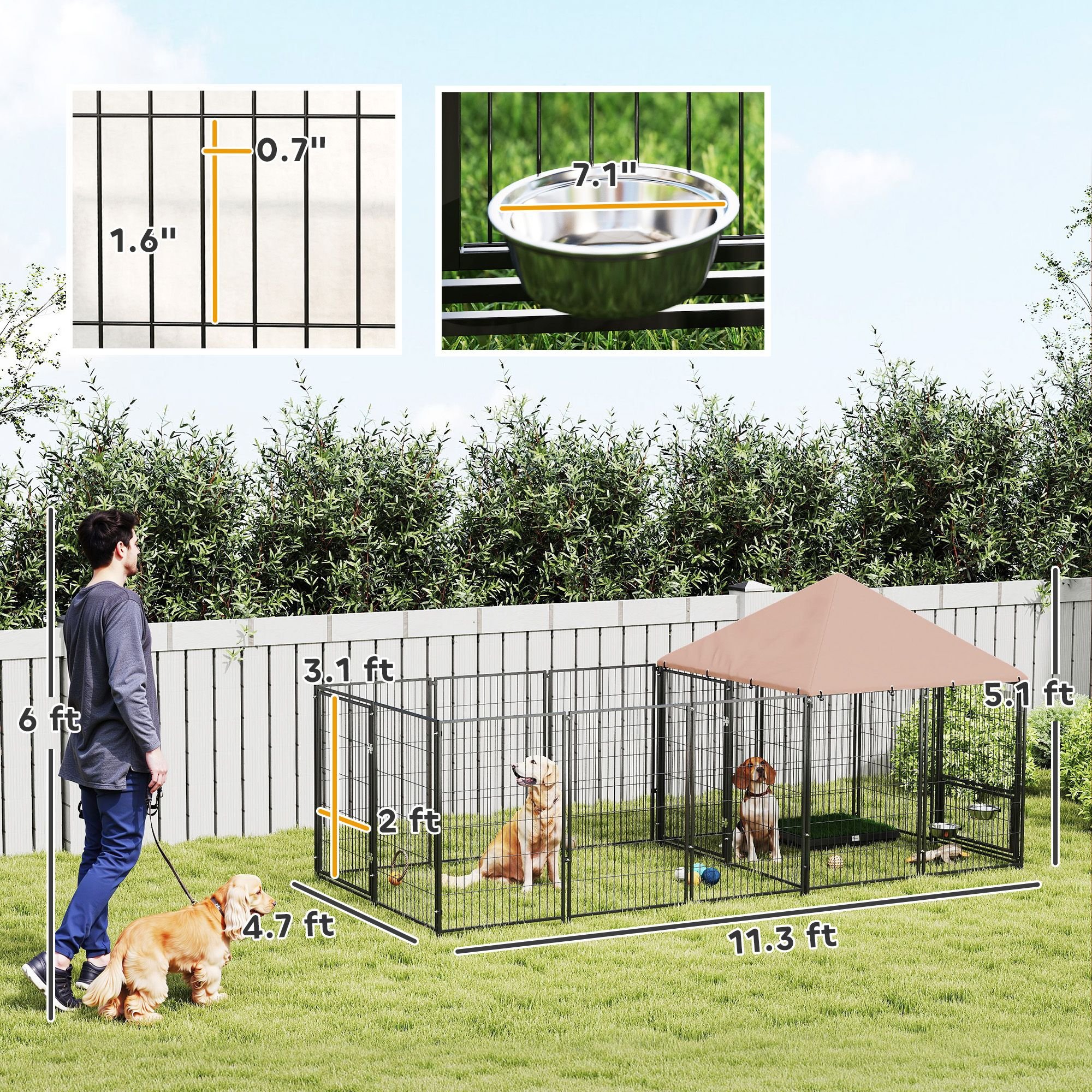 PawHut Large Outdoor Dog Kennel with Rotating & Adjustable Height Bowls, Waterproof & UV-Resistant Canopy, 11.3' x 4.7' x 5.1'